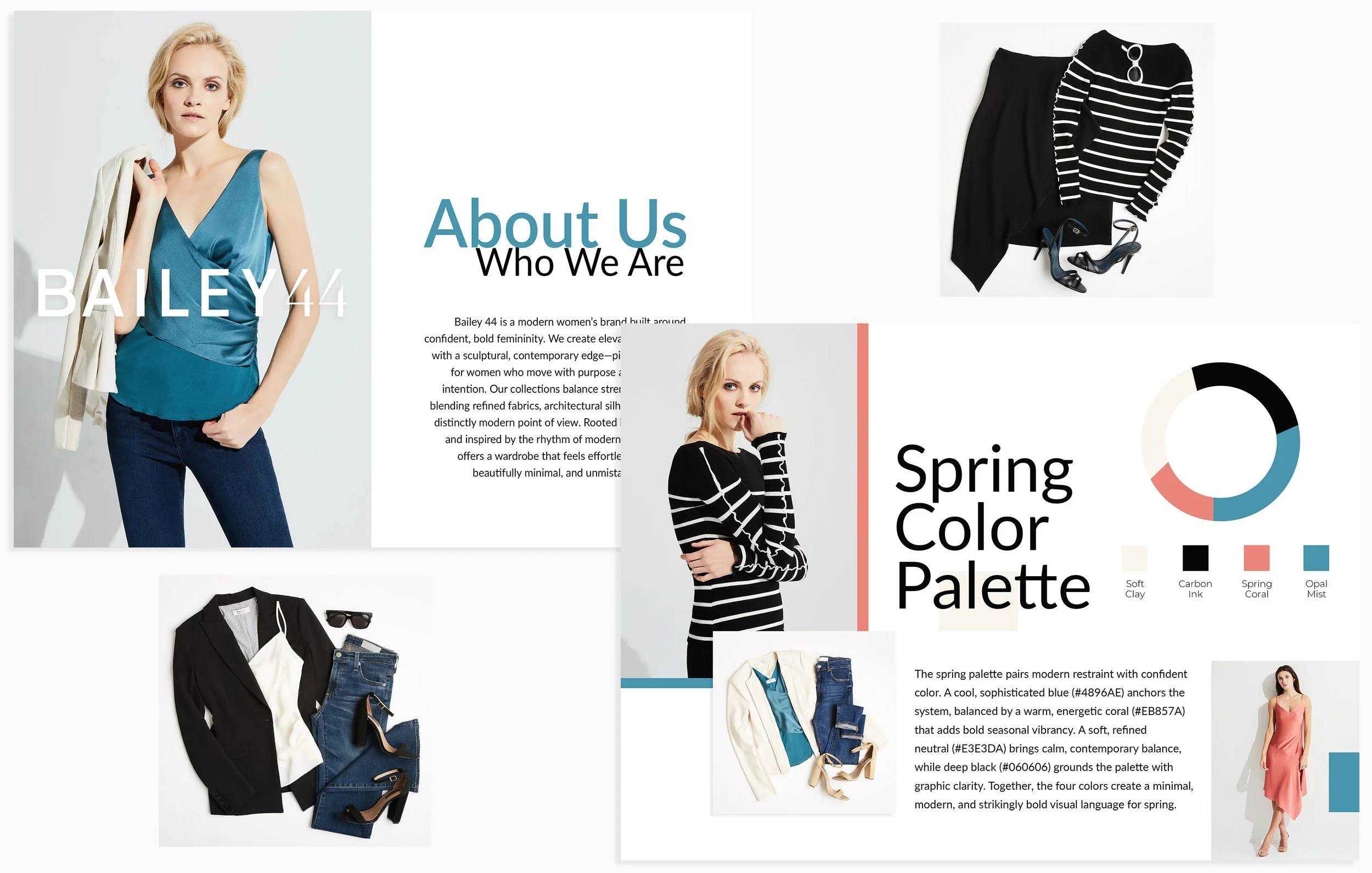 We created a modern, modular brand identity system built to stay timeless at its core while evolving each season through bold, curated color palettes and textures. Anchored in strong typography, high-contrast sculptural photography, and a clean architectural layout grid, the system gives Bailey 44 a consistent visual signature while allowing fresh, contemporary updates every collection. This approach keeps the brand instantly recognizable yet always modern—balancing creative flexibility with long-term cohesion.