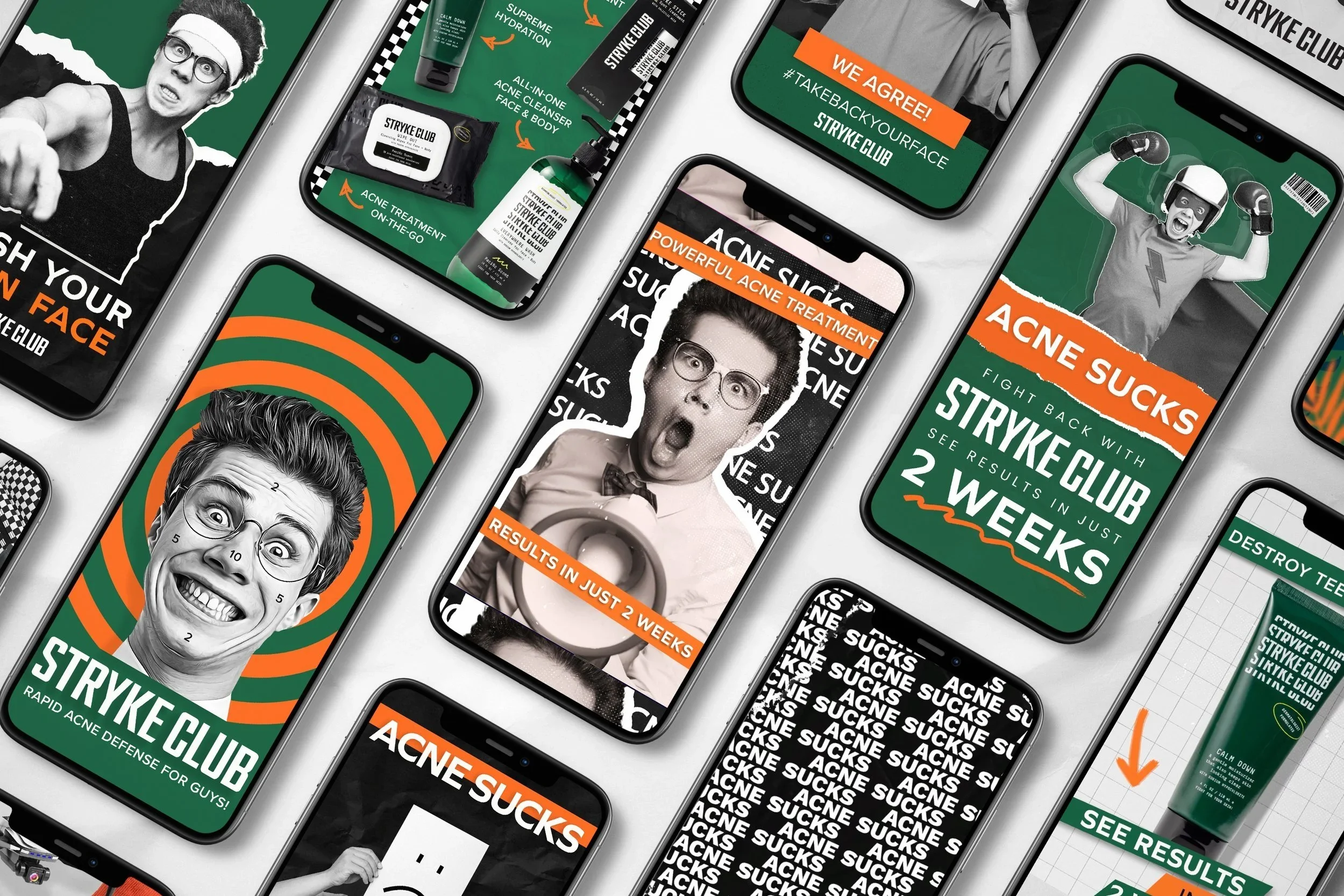 We dialed up the color saturation, contrast. We replaced the flat black with bold, high-contrast color blocking—branded green and bright orange with confident typography layered over a matte finish.